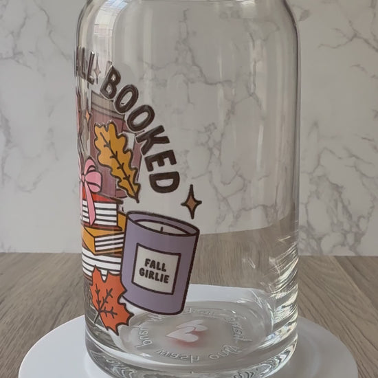 reusable iced coffee cup | libbey glass cup | UV DTF fall tumbler | i'm all booked glass | book lover fall glass cup | iced coffee cup with books | cozy autumn drinkware | fall aesthetic glass cup | pumpkin spice iced coffee glass | high-quality uv-dtf print