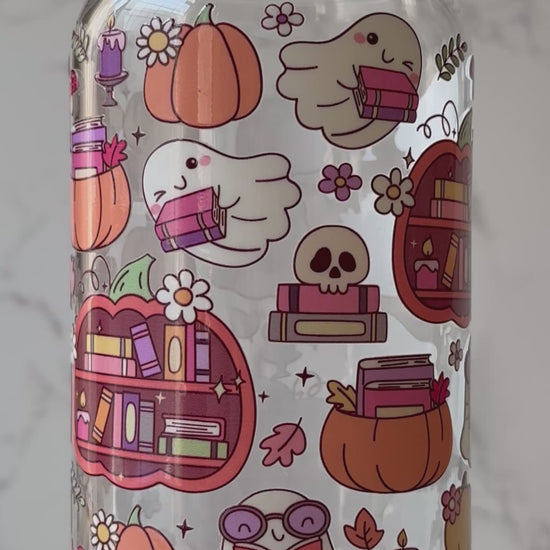 ghost glass cup | pumpkin bookshelf tumbler | bookish iced coffee glass | UV DTF halloween cup | fall aesthetic iced cup | ghost and books glass cup | cozy spooky season tumbler | libbey halloween glass | dark academia drinkware | autumn iced coffee glass | glass for iced drinks cute halloweenÂ
