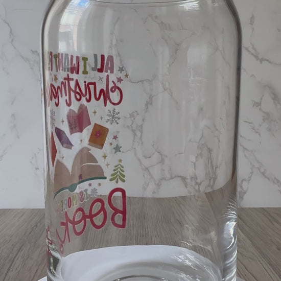 reusable iced coffee cup | libbey glass cup | UV DTF holiday tumbler | christmas book lover cup | all I want for christmas is more books glass | festive iced coffee cup | pastel holiday drinkware | cozy christmas reading glass | bookworm christmas gift | high-quality uv-dtf print