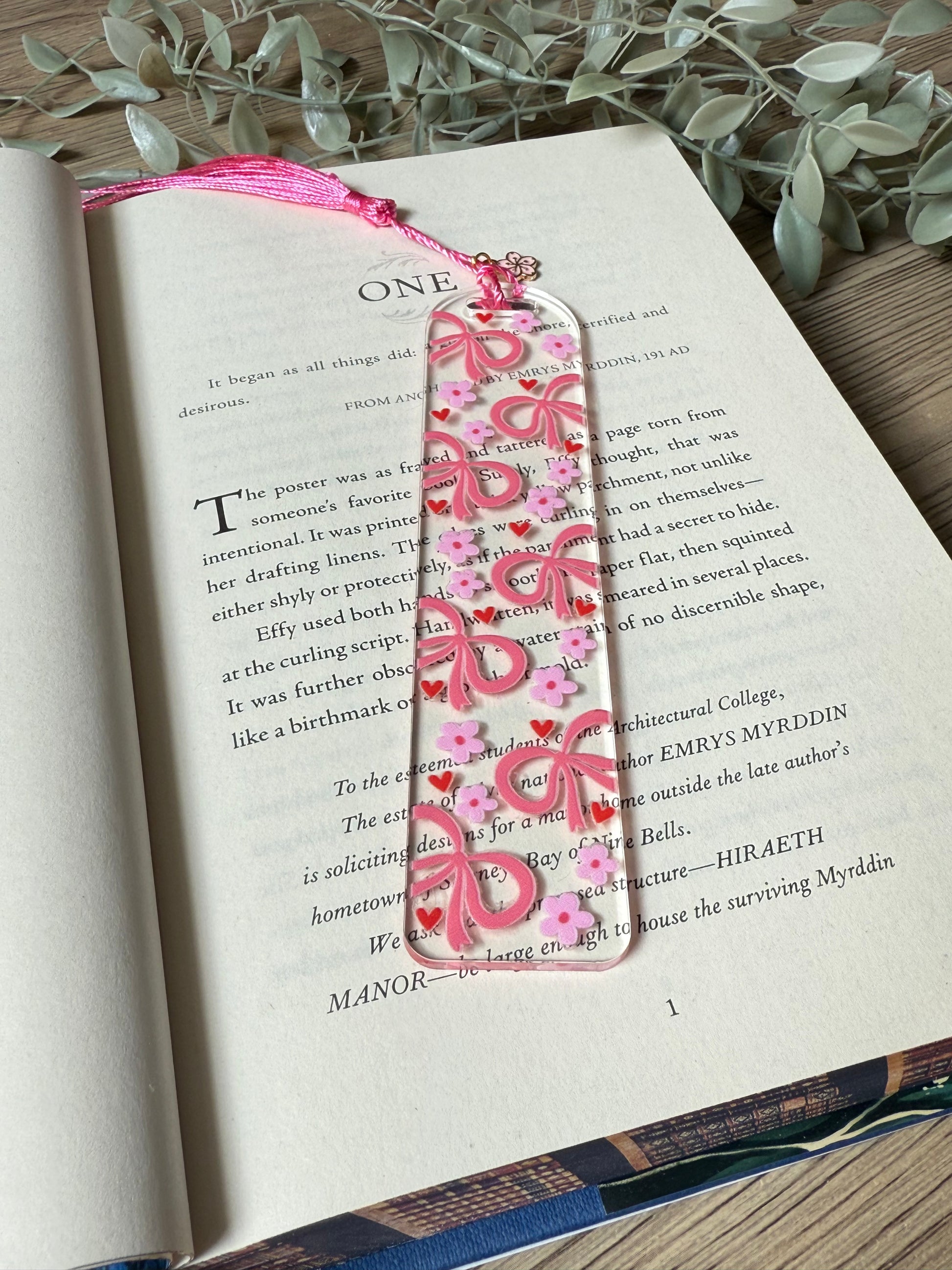 🌸 Pink Bows & Flowers Acrylic Bookmark with Enamel Charm: