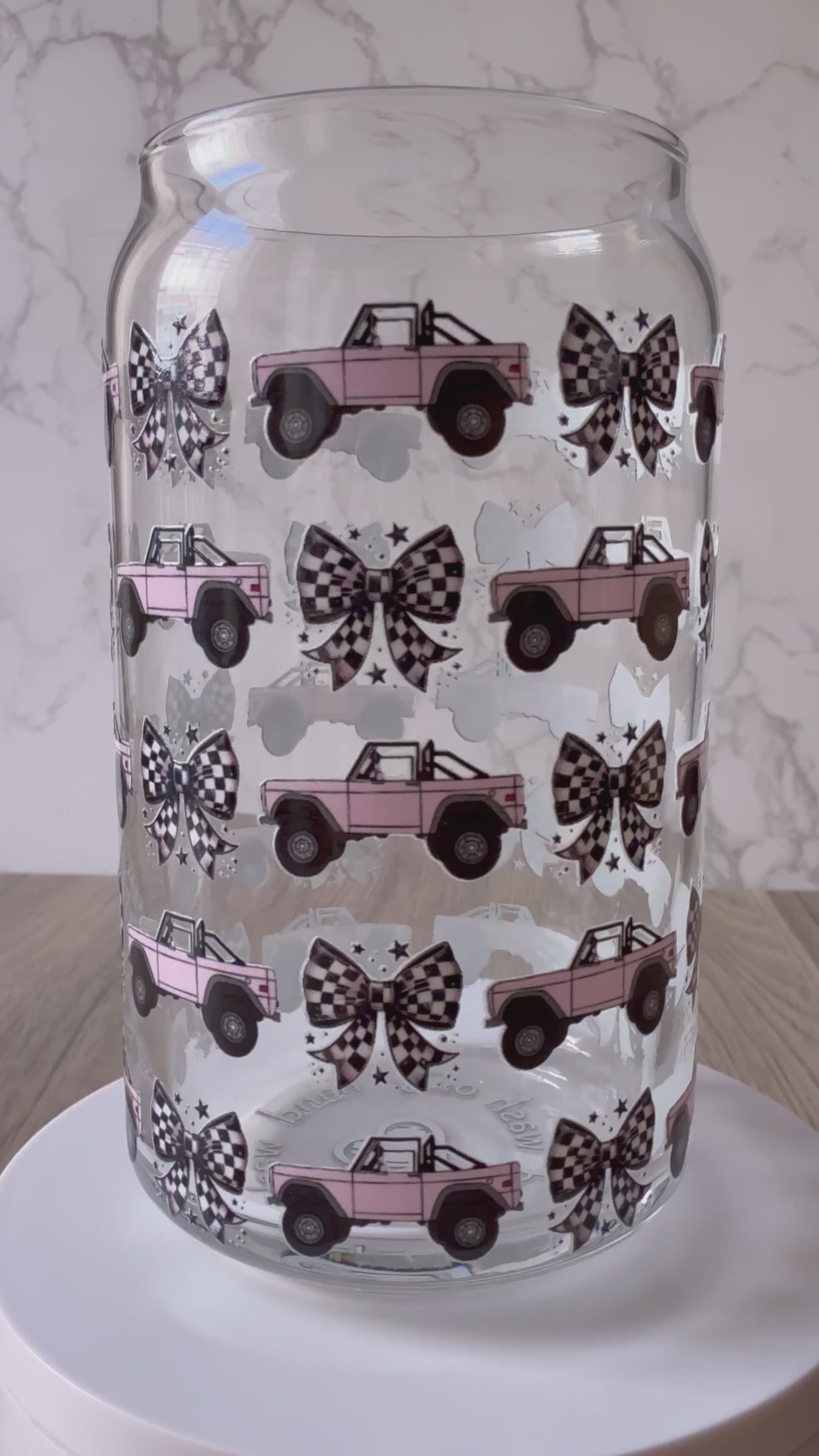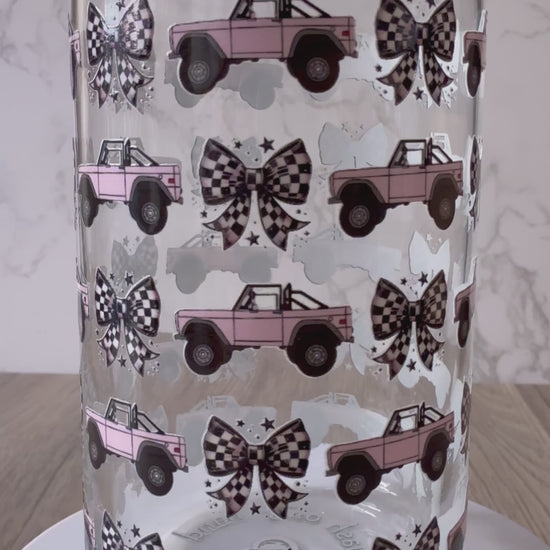 reusable iced coffee cup | libbey glass cup | UV DTF car girl cup | pink truck tumbler | truck girl iced coffee glass | race track bow cup | girly motorsports drinkware | black and white checkered cup | cute car aesthetic cup | high-quality uv-dtf print