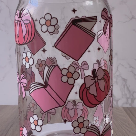 reusable iced coffee cup | libbey glass cup | UV DTF fall cup | pumpkin aesthetic tumbler | bows and books iced coffee glass | cozy autumn drinkware | iced coffee glass for fall | pumpkin spice cup | fall aesthetic cup | high-quality uv-dtf print