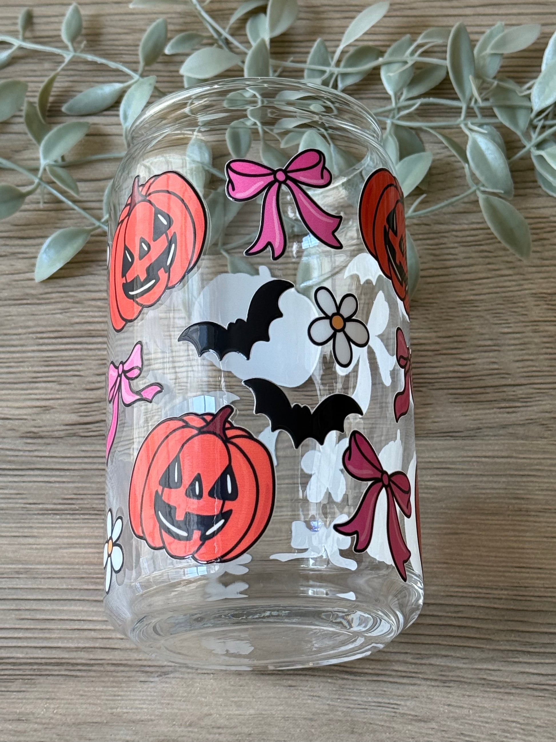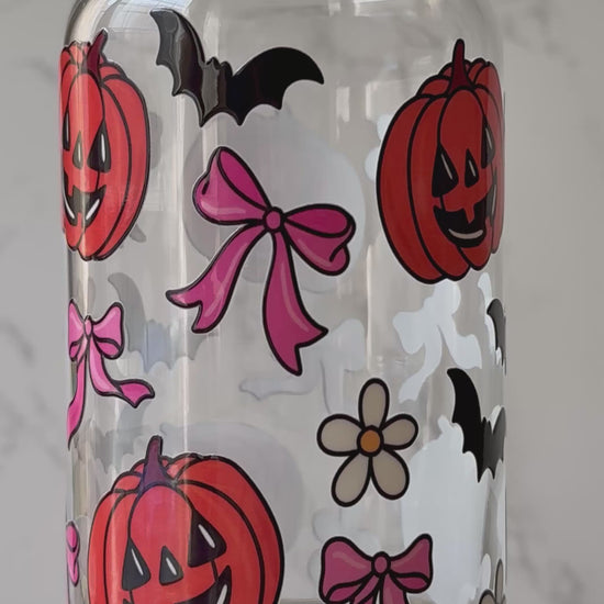Sweet, spooky, and sprinkled with charm — this 16oz Libbey glass iced cup showcases a cheerful UV DTF wrap filled with smiling pumpkins, fluttering bats, soft florals, and dainty pink ribbons. It's made for those who like their spooky season with a side of sweetness.
