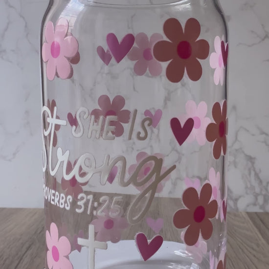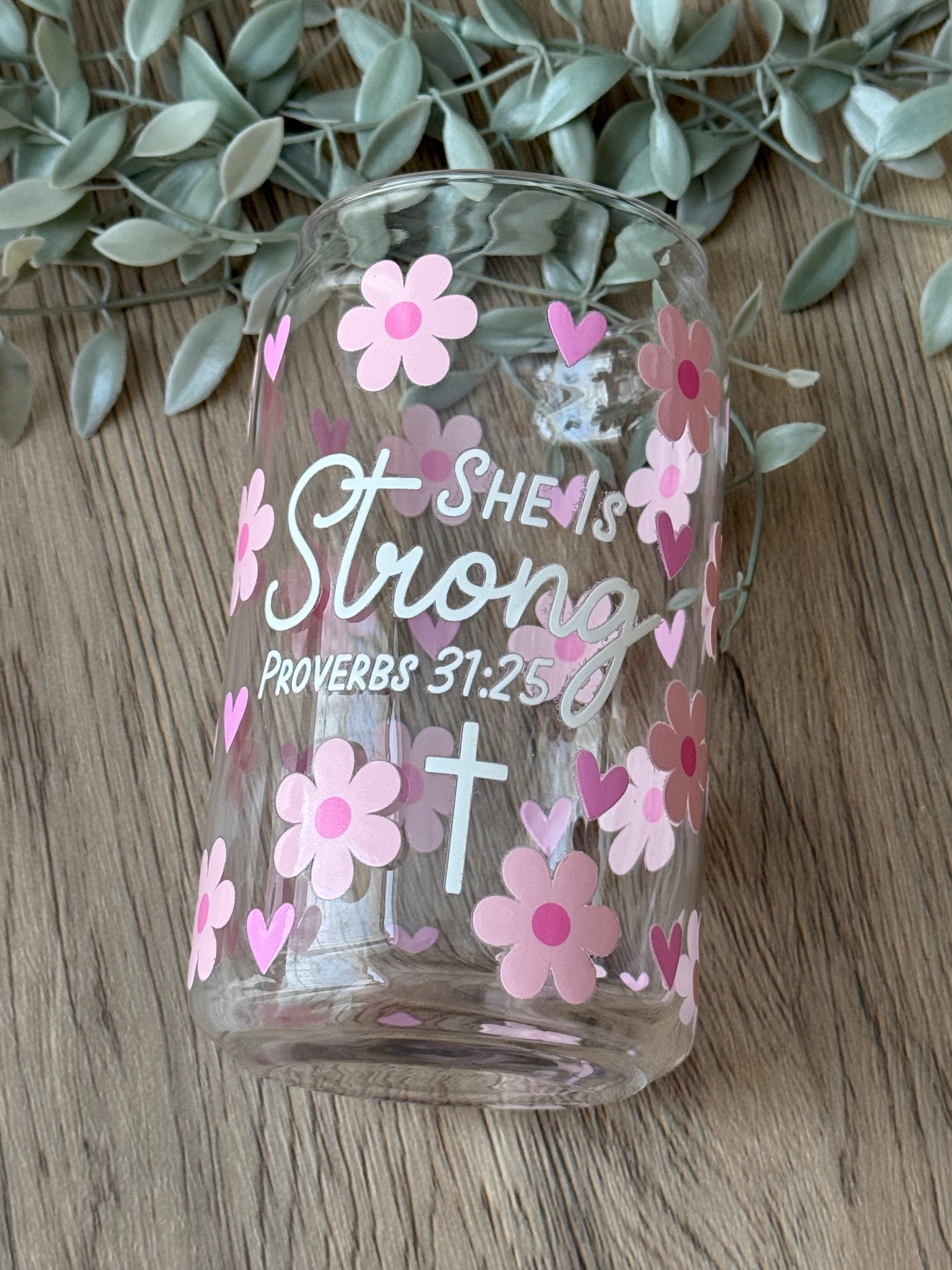 This Libbey glass iced cup features a premium UV DTF wrap design that reads “She is Strong – Proverbs 31:25” surrounded by soft pink florals. A gentle reminder of strength, faith, and grace — perfect for quiet mornings or coffee on the go.