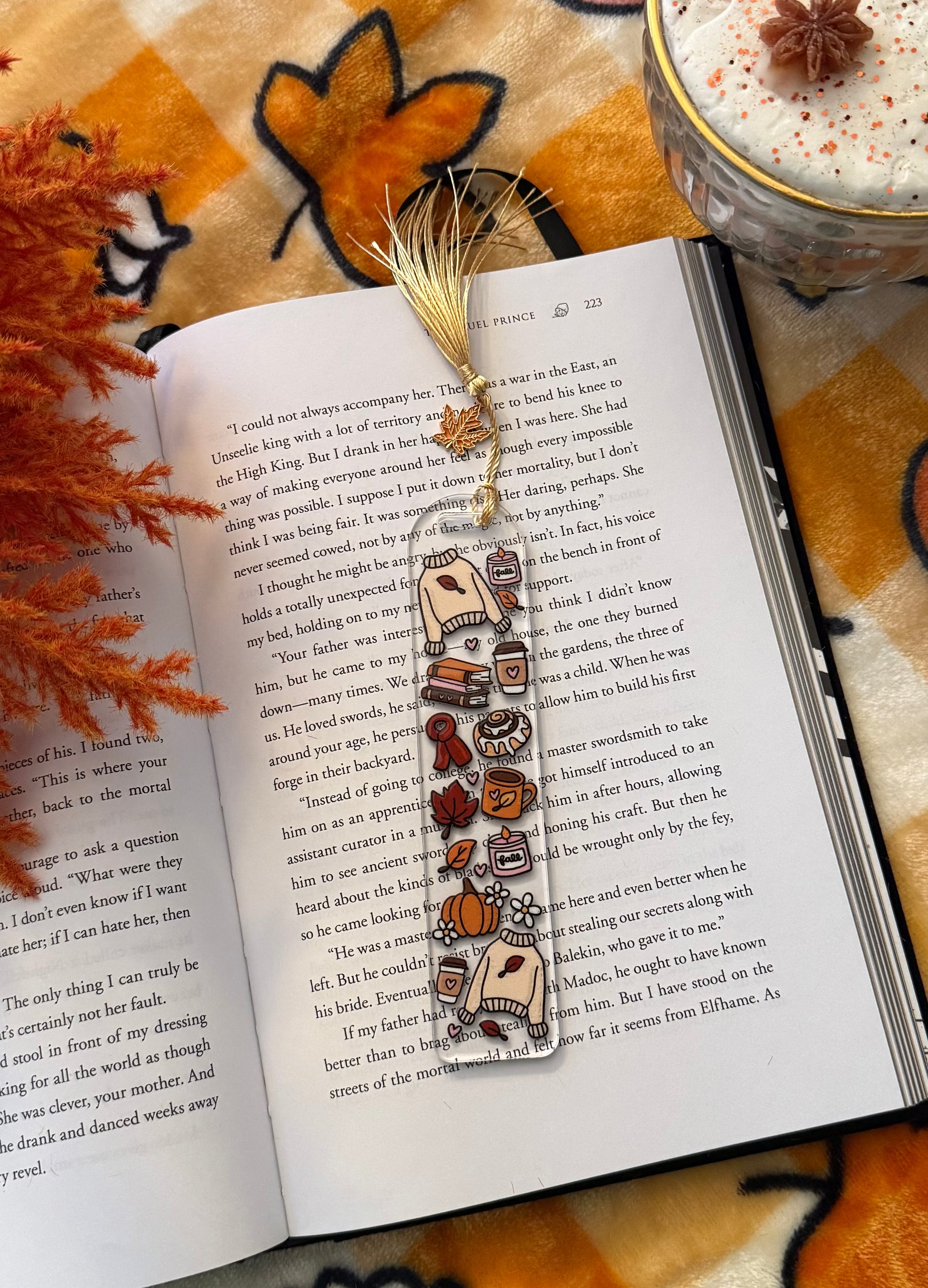 🧣 Sweater Weather Acrylic Bookmark – Cozy Candles, Cinnamon Rolls & Autumn Leaf Charm: