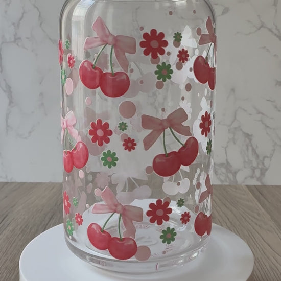 reusable iced coffee cup | libbey glass cup | UV DTF cherry cup | bows and flowers tumbler | fruity iced coffee glass | floral drinkware | summer aesthetic glass cup | iced coffee glass with cherries | cute bow design cup | high-quality uv-dtf print