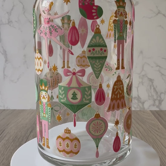 reusable iced coffee cup | libbey glass cup | UV DTF Christmas cup | pastel nutcracker tumbler | holiday themed glass cup | iced coffee glass for Christmas | girly holiday drinkware | nutcracker drink cup | festive iced coffee glass | high-quality uv-dtf print