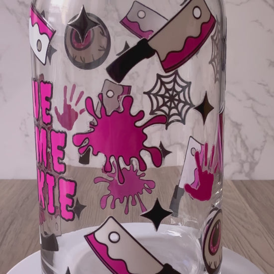 reusable iced coffee cup | libbey glass cup | UV DTF true crime cup | iced coffee glass for murder podcast lovers | spooky cute tumbler | halloween coffee cup | creepy aesthetic glass cup | blood and knife design cup | true crime themed drinkware | high-quality uv-dtf print