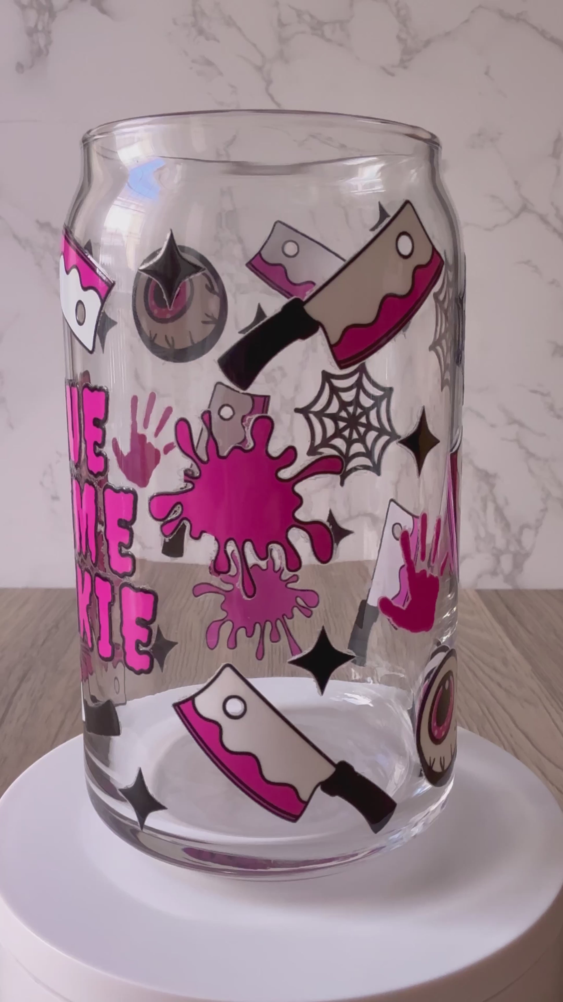 If your ideal afternoon includes iced coffee and a deep dive into unsolved mysteries, this one’s for you. Featuring a premium UV DTF wrap design that reads “True Crime Junkie,” this Libbey glass cup is decorated with playful graphics like fake eyeballs, blood splatters, and spattered knives — the perfect mix of spooky and cute for at-home detectives.